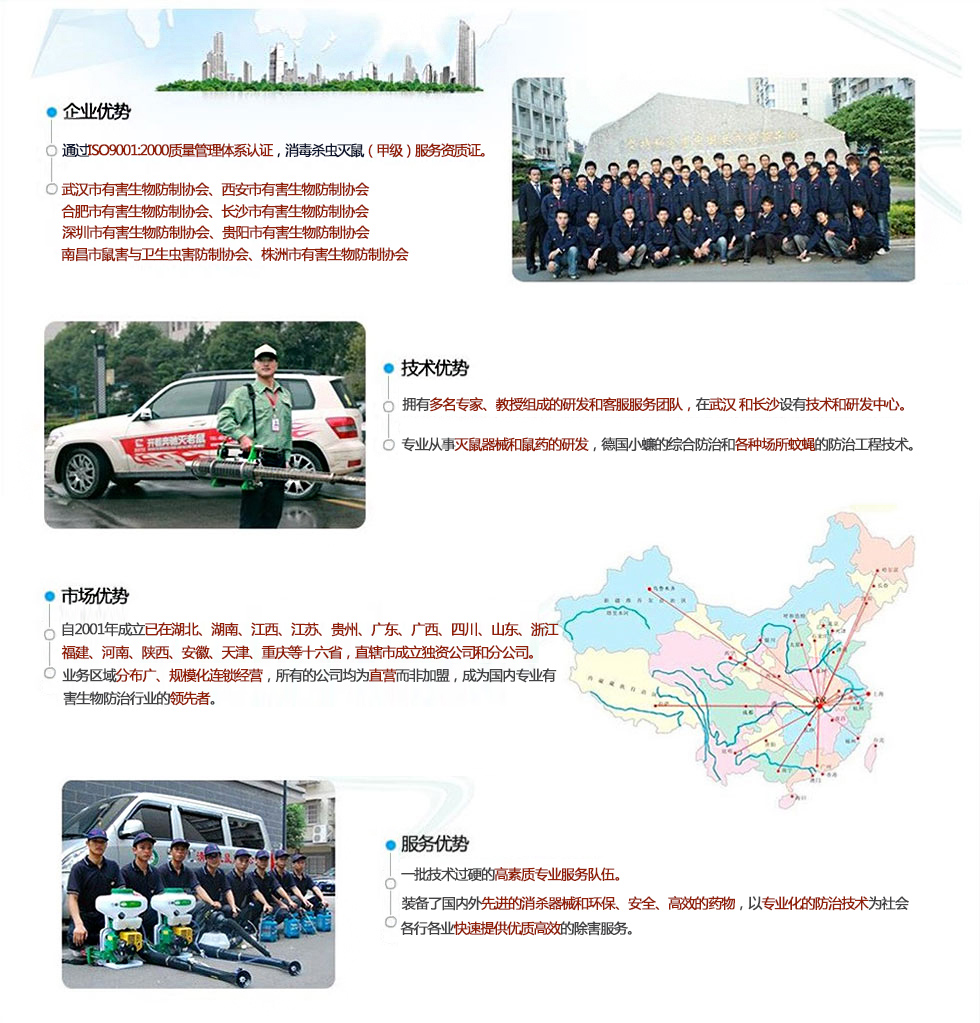 我們堅持“誠信、高效、安全、環!钡姆⻊兆谥迹闷餍稻鶠槭澜鐑炠|產品,所用藥物均系國家藥檢部門和衛生防疫部門批準的安全、低毒的城市衛生用藥,并根據具體作業環境和防治對象情況變化,制定具體防制方案,保證優越的防治效果和人體安全。